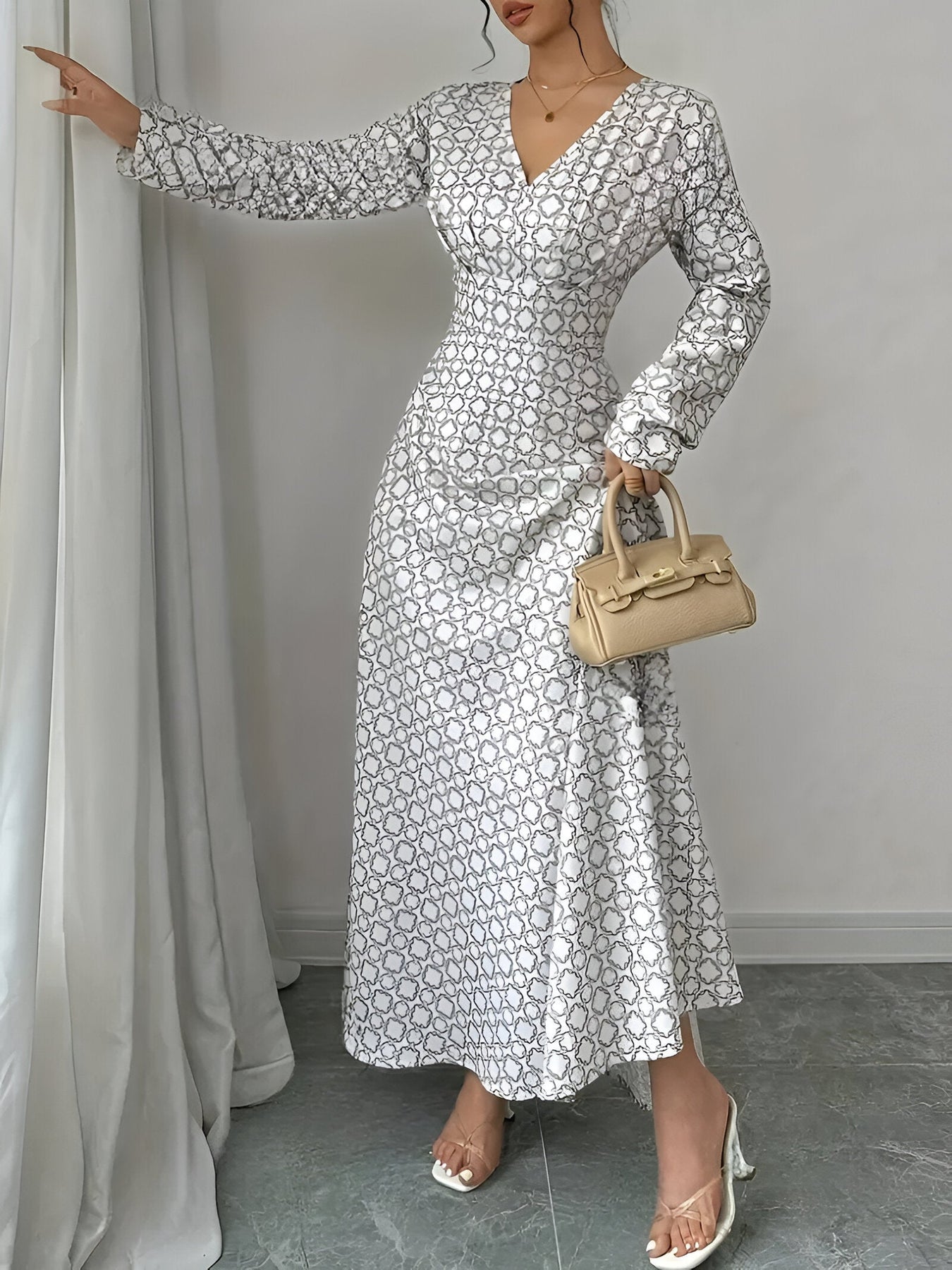 Stell dir vor, du schlüpfst in ein Kleid, das perfekt eine Kombination aus Raffinesse und Komfort vereint und dir das Gefühl von Selbstbewusstsein verleiht, ganz gleich, zu welchem Anlass. Mit dem schmeichelnden V-Ausschnitt, langen Ärmeln und der wunderschön geprägten Taille bringt dieses Kleid einen Hauch von zeitloser Eleganz in deine Garderobe. Das bedruckte Design und der Maxi-Rock fließen elegant und bieten einen mühelos schicken Look, der sich perfekt von Saison zu Saison anpasst. Egal, ob du dich für ein besonderes Event kleidest oder ein stilvolles Alltagsoutfit suchst – dieses Kleid ist die ideale Wahl.