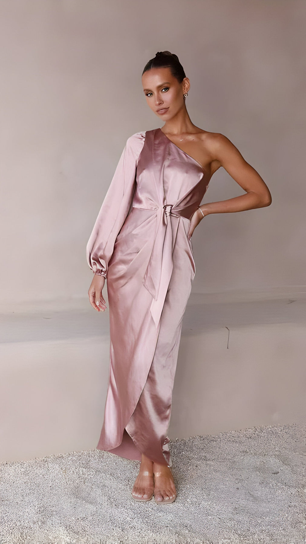 Stell dir vor, du betrittst einen Raum und alle Blicke sind auf dich gerichtet, während du mit müheloser Anmut schreitest. Dieses luxuriöse einseitige Satin-Maxi-Kleid wurde entworfen, um dich bei jedem besonderen Anlass wie einen Star fühlen zu lassen. Mit seinem asymmetrischen Design, zartem Schleifen-Detail und dem eleganten Laternenärmel verleiht es dir die perfekte Ausstrahlung für Hochzeiten, Galas oder jedes Event, das etwas mehr Glamour verlangt.