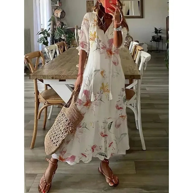 Emma – Blau-Weißes Maxikleid, ein frisches und maritimes Kleid für sonnige Tage. Mit fließendem Schnitt und luftigem Design sorgt es für hohen Tragekomfort und stilvolle Leichtigkeit – ideal für Strandtage, Urlaube oder sommerliche Ausflüge.