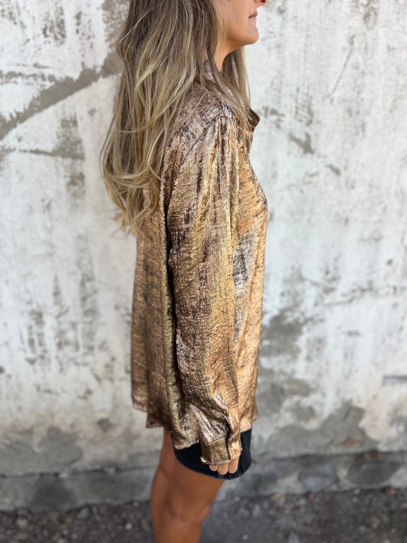 Diese Bluse begeistert mit ihrem glänzenden Finish und einer strukturierten Oberfläche, die jedes Outfit sofort aufwertet. Der klassische Hemdblusenkragen und die durchgehende Knopfleiste sorgen für eine stilvolle Basis, während die Brusttasche und der lässige Schnitt den modernen Charakter unterstreichen. Ob offen über einem Top oder geschlossen getragen – diese Bluse bringt Glamour in den Alltag.
