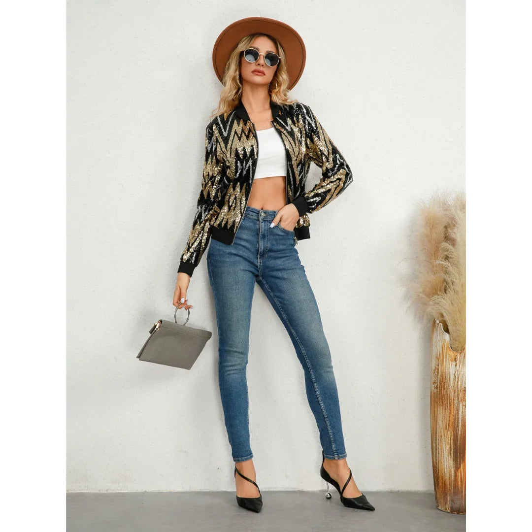 Damen bomberjacke mit Paillettenmuster und Reißverschluss schwarz-gold