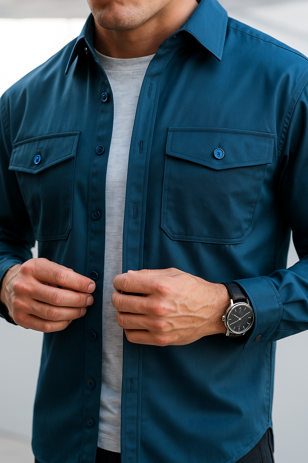 • Design: Knopfleiste, Umlegekragen, zwei Brusttaschen mit Patte, Knopfmanschetten