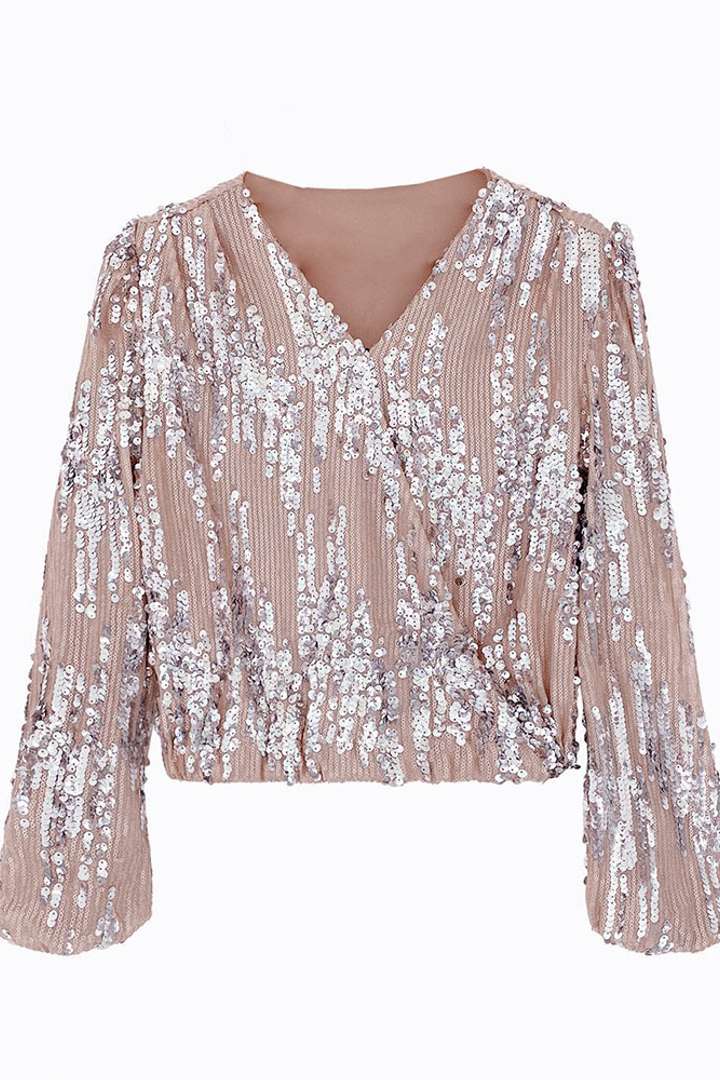 Das Top überzeugt durch seinen eleganten V-Ausschnitt, die funkelnden Pailletten und die schmeichelhaften langen Ärmel, die für einen edlen Look sorgen. Mit seinem schmalen Schnitt, der Ihre Figur vorteilhaft betont, ist dieses Top der ideale Begleiter für stilvolle Partys, besondere Anlässe und festliche Abende. Es kombiniert modernen Chic mit einem Hauch von Extravaganz und sorgt so für einen unvergesslichen Auftritt.