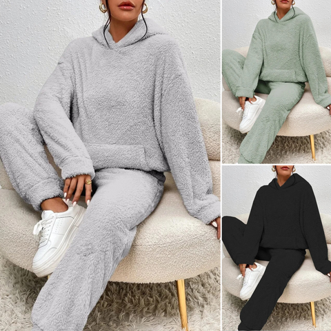 Grace ist ein Teddy-Set mit Kapuze, das Wärme und Komfort vereint. Der weiche Stoff fühlt sich wunderbar auf der Haut an, während die lässige Passform für einen entspannten Look sorgt. Die Kapuze bietet zusätzlichen Schutz vor Kälte, während die passende Hose das Set vervollständigt. Perfekt für zu Hause oder unterwegs an kalten Tagen.