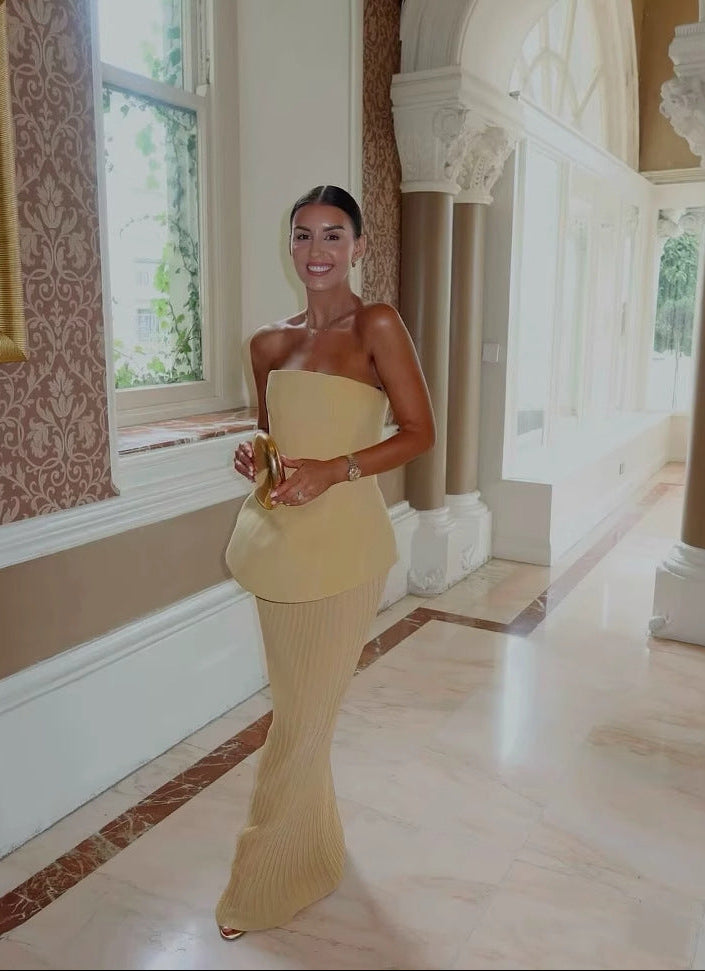 Ina ist ein echter blickfang für stilbewusste frauen, die elegante silhouette mit modernen details verbinden möchten. das trägerlose oberteil formt ein schönes dekolleté, während der plissierte rock und das peplum-detail einen femininen und selbstbewussten auftritt garantieren. ideal für hochzeiten, empfänge oder formelle events – dieses kleid bringt minimalistische eleganz auf den punkt.