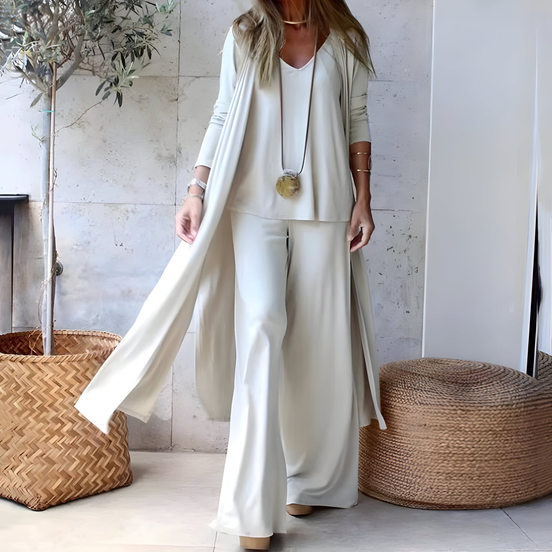 Dieses dreiteilige Set kombiniert elegantes Design mit ultimativen Komfort – perfekt für jede Gelegenheit. Ob im Büro oder beim Abendessen, es sorgt dafür, dass du den ganzen Tag über gepflegt und selbstbewusst aussiehst.