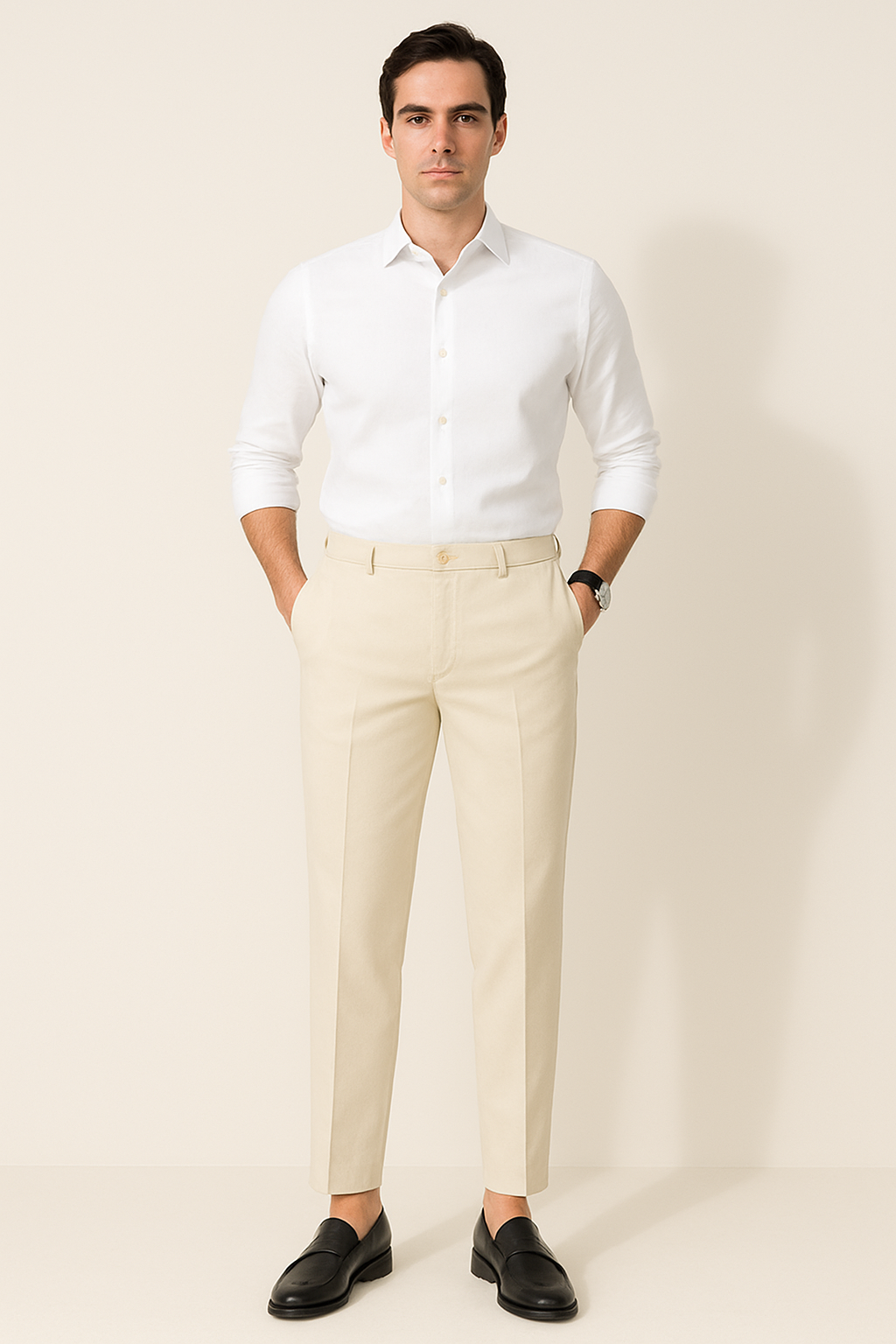 Der schmale Schnitt mit Bügelfalte sorgt für eine klare Silhouette, während das hochwertige Material Bewegungsfreiheit und Komfort bietet. Ideal für formelle Anlässe oder stilvolle Office-Looks.