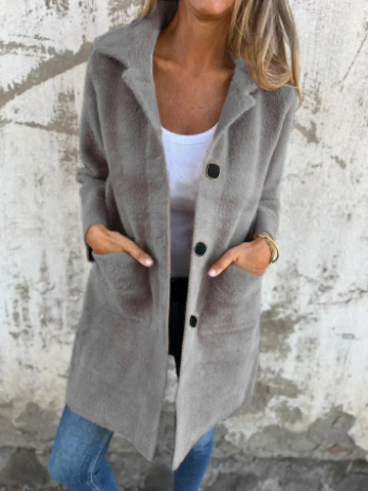 Dieser grobe Mantel verleiht Ihrem Outfit einen Hauch von Eleganz. Perfekt kombiniert mit Jeans und Sneakers, sorgt er für einen entspannten und dennoch stilvollen Look, der Sie durch kühle Tage begleitet.